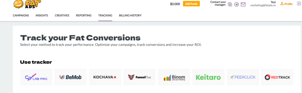 FatAds is officially integrated with 8 popular tracking platforms. You can use ready-to-go integration guides for RedTrack, CPV lab, Binom, Keitaro, BeMob, Kochava, FunnelFlux. The platform also supports integration with PeerClick tracker.