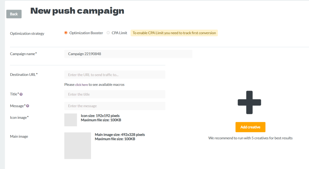Go to “Optimization strategy” and simply select “Optimization booster”, then complete the basic campaign setup.